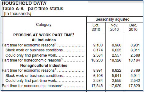 - The number of persons employed part time for economic reasons (sometimes referred to as involuntary part-time workers) was essentially unchanged in December at 8.9 million. These individuals were working part time because their hours had been cut back or because they were unable to find a full-time job.