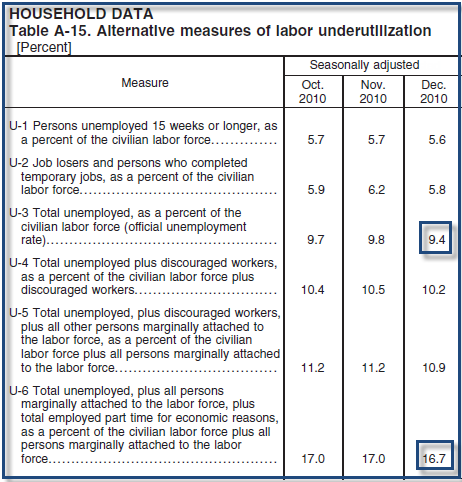 The official unemployment rate is 9.4%. However, if you start counting all the people that want a job but gave up, all the people with part-time jobs that want a full-time job, all the people who dropped off the unemployment rolls because their unemployment benefits ran out, etc., you get a closer picture of what the unemployment rate is. That number is in the last row labeled U-6.