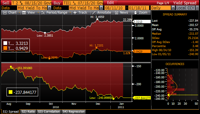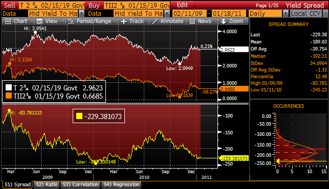 At some point in the near future Ben is going to defend QE. I think he will say that his policies are responsible for 90% of the stock market advance and less than 10% of the commodities. In other words; he will talk his book. There is one area that provides a clear-cut measure of what the Fed is doing. I doubt even Ben would argue that he is not 95% responsible for this success/failure. Inflation expectations have widened substantially since QE2 was first brought up by the Chairman in Jackson Hole. Consider these charts of 10-year coupons Vs Tips: