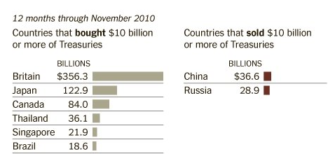 For the first 11 months of 2010, American banks, institutions and individuals bought about three-fifths of the $1.5 trillion of additional Treasury debt, while China sold some and other foreign jurisdictions bought the rest.
