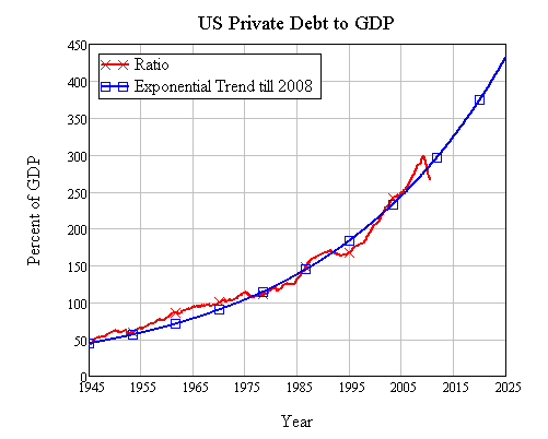 For the record, the actual rate of growth of the private US debt to GDP ratio was roughly 2.9% p.a. from 1945 till 2008. That means that the ratio doubled every 25 years, from 45% in 1945 to 90% in 1970, 180% in 1995, and if it had kept going, it would have been 360% in 2020.