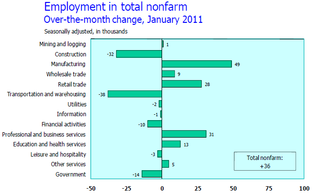 The unemployment rate fell by 0.4 percentage point to 9.0 percent in January, while nonfarm payroll employment changed little (+36,000), the U.S. Bureau of Labor Statistics reported today. Employment rose in manufacturing and in retail trade but was down in construction and in transportation and warehousing. Employment in most other major industries changed little over the month.