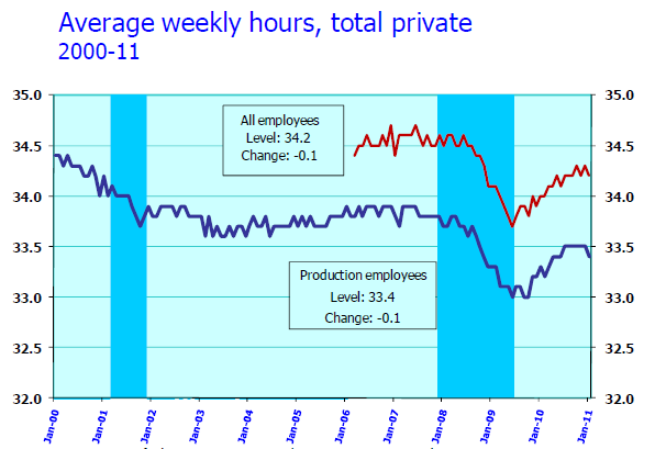 The average workweek for all employees on private nonfarm payrolls fell by 0.1 hour to 34.2 hours in January. The manufacturing workweek for all employees rose by 0.1 hour to 40.5 hours, while factory overtime remained at 3.1 hours. The average workweek for production and nonsupervisory employees on private nonfarm payrolls declined by 0.1 hour to 33.4 hours; the workweek fell by 1.0 hour in construction, likely reflecting severe winter weather.