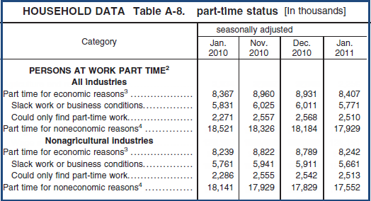 - The number of persons employed part time for economic reasons declined from 8.9 to 8.4 million in January. These individuals were working part time because their hours had been cut back or because they were unable to find a full-time job.