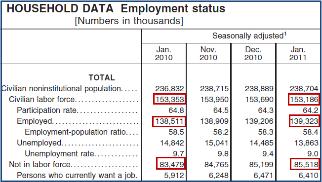 The unemployment rate (based on the household survey), unexpectedly fell from 9.4% to 9.0%. How did that happen?