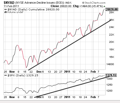 One chart I keep a careful eye on is the NYSE Advance/Decline line which basically is a pictorial view of net advances of all stocks on the New York Stock Exchange. When advancing stocks exceed decliners, the line goes up and it goes down when there are more declining stocks than advancing.