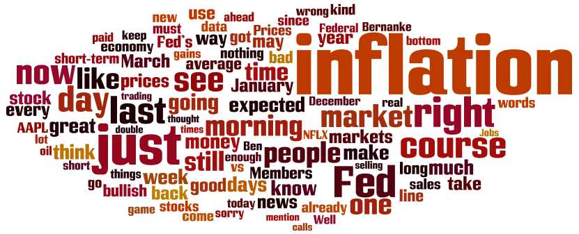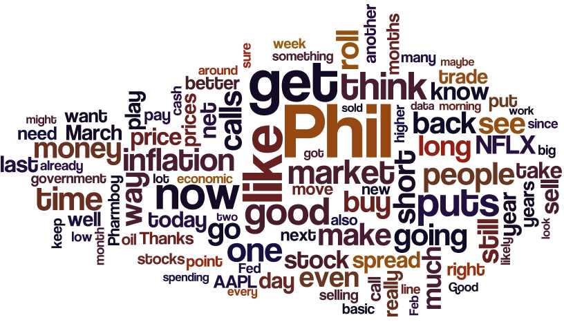 As I have noted, WAY too many people are playing NFLX! We can expect to see my name up in lights but NFLX and AAPL are the only stock that get mentioned so often that they make the top 100 words. Perhaps we can figure out how to extract a symbol search as that would also be fun to track over time.