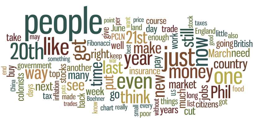 Now, here’s something interesting. As it was a long weekend, I took the opportunity to get back in touch with my inner Liberal and we had some free-ranging discussions on the economy and society. The following is a tag cloud of posts and comments since Friday evening (right after our 5 bullish energy trades and including my take on the American Revolution):