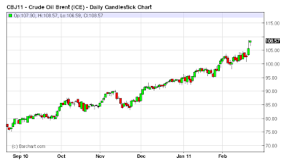Crude oil prices shot up on Monday to a fresh 2½-year high above $105 a barrel as traders braced for the impact of political unrest in Libya, the first major oil exporting country to be hit by turmoil in the Middle East. Brent rallied further in after-hours trading, up to $108.70 a barrel.