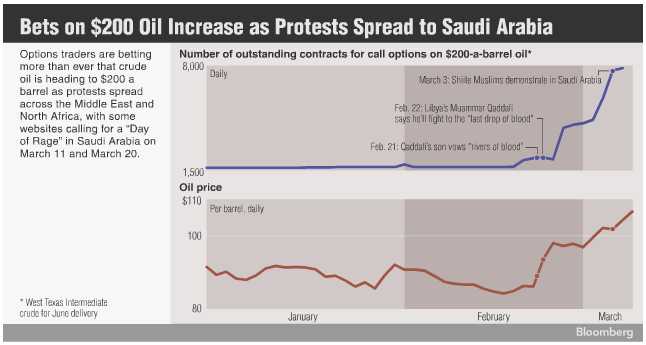 Speaking of lying, manipulative bastards who sell our country down the river to line their own pockets (no, not Scott Walker this time although here’s another great Jon Stewart bit on Wisconsin) – Goldman Sach’s David Greely is pushing for $200 oil by contending that OPEC’s spare capacity is lower than commonly estimated and the cartel will not be able to accommodate a prolonged supply disruption.