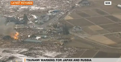 NHK showed images of people getting medical treatment in northern Japan and footage of a tsunami sweeping buildings across farmland as far as 1.5 kilometers inland. Ships were smashed into harbor walls and cars were washed away. More here >