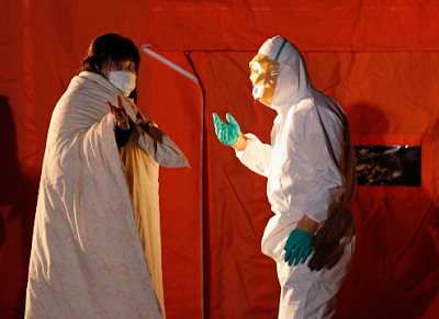 An official in protective gear talks to a woman who is from the evacuation area near the Fukushima Daini nuclear plant in Koriyama March 13. Japanese Chief Cabinet Secretary Yukio Edano confirmed on Saturday there has been an explosion and radiation leakage at Tokyo Electric Power Co’s (TEPCO) Fukushima Daiichi nuclear power plant. (Kim Kyung-Hoon/Reuters)