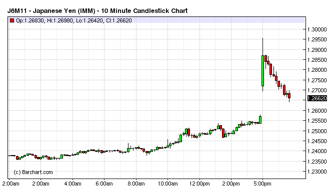 Currency traders are watching amazing moves in the Yen today as shown in following chart 10-minute chart.