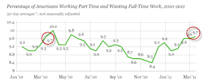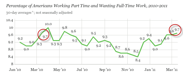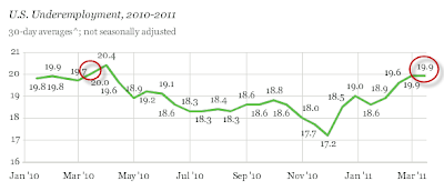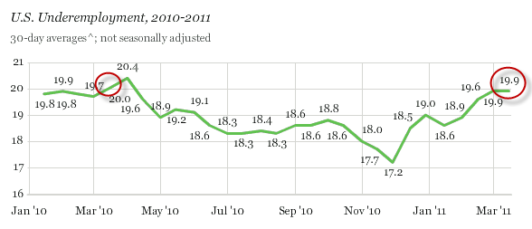 However, Gallup’s unemployment and underemployment measures have not shown the same gains in early 2011. Gallup finds an unemployment rate (10.2%) and an underemployment rate (19.9%) for mid-March that are essentially the same as those from mid-March 2010.