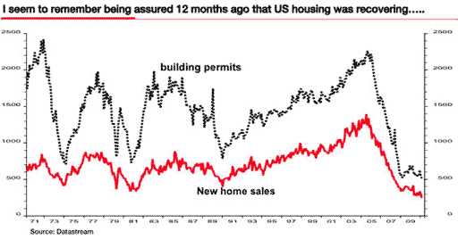 I don’t normally write about monthly data releases but I want to make an exception this week regarding February’s shock 16.9% mom decline in US new home sales. With sales languishing at a record low, I had to laugh when I read the Reuters story. The phrase that made me chuckle was "despite the surprise plunge in sales, economists do not believe a new downturn is underway" Are they nuts?! We are plunging to new all time lows for many housing indicators (see chart below) and we are not in a new downturn? I know this industry has a consistent bias towards optimism about which one gets rather blasé, but this really does deserve some sort of special award. I’m going to think of a name.