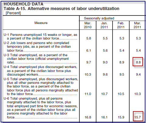 While the "official" unemployment rate is an unacceptable 8.8%, U-6 is much higher at 15.7%.