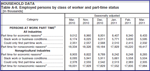 - The number of persons employed part time for economic reasons was little changed in March, at 8.4 million. These individuals were working part time because their hours had been cut back or because they were unable to find a full-time job.