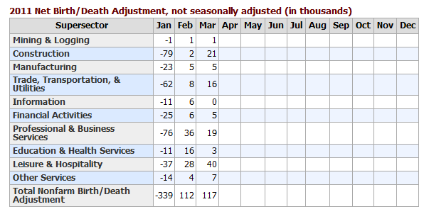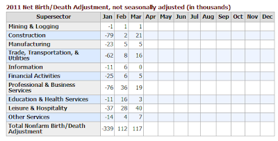 Birth/Death assumptions are supposedly made according to estimates of where the BLS thinks we are in the economic cycle. Theory is one thing. Practice is clearly another as noted by numerous recent revisions.