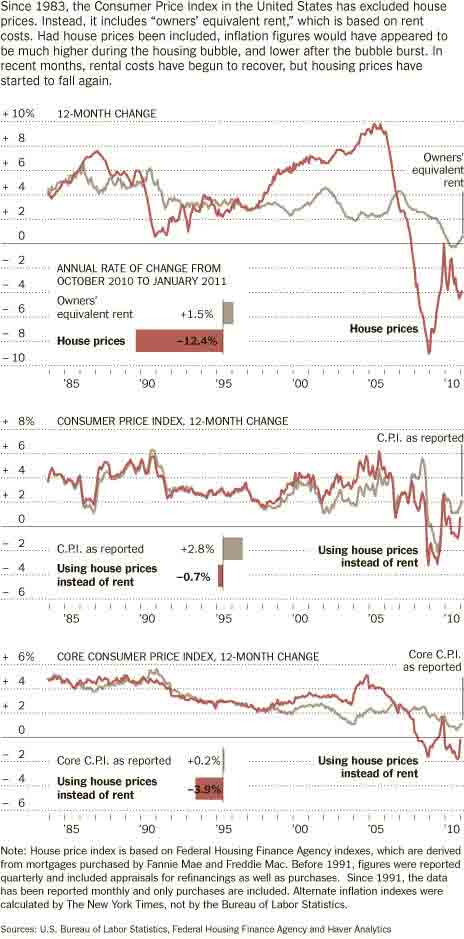 Until 1983, the Consumer Price Index included housing costs. But then the index was changed. No longer would home prices directly affect the index. Instead, the Bureau of Labor Statistics makes a calculation of "owners’ equivalent rent," which is based on the trend of costs to rent a home, not to buy one. The current approach, the B.L.S. says, "measures the value of shelter to owner-occupants as the amount they forgo by not renting out their homes." The C.P.I. is not supposed to include investments, and owning a house has aspects of both investment and consumption.