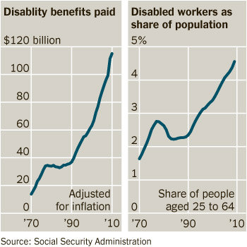 In a very related story, the WSJ says insolvency looms as states drain the U.S. disability fund. According to this article, we have yet another future bailout (along with the state and local pension plans) coming down the road.