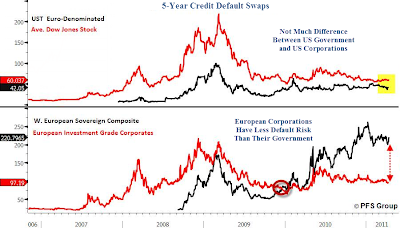 Here is an interesting chart from Chris Puplava at PFS Group (Financial Sense) comparing default risk in the US vs Europe.