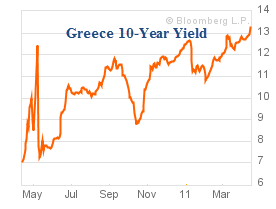 Greek and Portuguese Euro-based sovereign debt yields hit new highs today with the Greek 10-Year sovereign bond yield topping 13% for the first time in the history of the Euro and the Portuguese yield