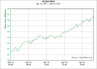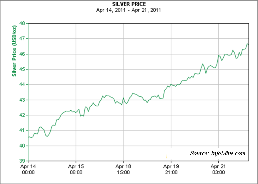 If you think the crude oil market has gone totally out of control in the past month or so, observe the Silver. The Silver market has basically gone parabolic the week of April 17, going from $41.75 on April 15th to $46.69 on April 21st–a 12% move in 5 trading days, topping off the move with a 5% move on Thursday (See Chart)
