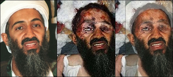 Furthermore, the facial expression and beard are very reminiscent of a 1998 image of bin Laden, the first picture shown below. Next to it, we show the original resolution of the “corpse” image as we’ve seen it (197 by 263 pixels), “flopped” 180 degrees on the horizontal axis to conform to the original 1998 image’s beard orientation. The third image is a blended image of the two, with the “corpse” image at 100 percent opacity below the original image at 43 percent opacity. The way the images “lock” in place at the mouth, beard and nose indicate to us that the image circulating on the Web and some foreign television outlets is nothing but a clumsy fake: