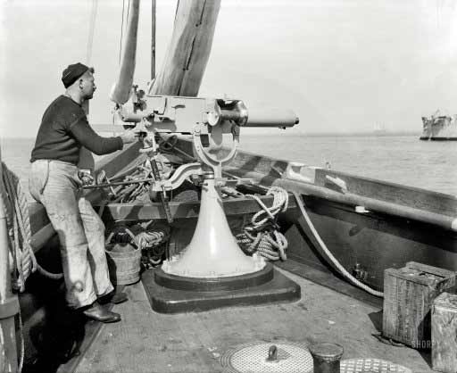 "U.S.S. Vixen, Maxim machine gun and gunner Smith, who fired 400 consecutive shots at Battle of Santiago de Cuba, July 3, 1898"