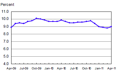 Nonfarm payroll employment rose by 244,000 in April, and the unemployment rate edged up to 9.0 percent, the U.S. Bureau of Labor Statistics reported today. Job gains occurred in several service providing industries, manufacturing, and mining.