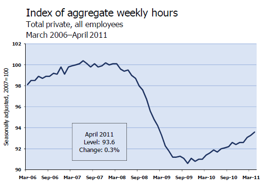 The index of aggregate weekly hours for all employees rose by 0.3 percent over the month. Since reaching a low point in October 2009, the index has increased by 3.3 percent.
