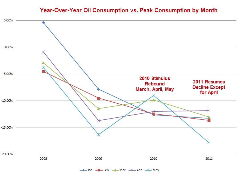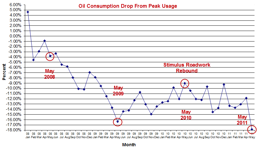 For all the brouhaha over the "recovery" one cannot see it in oil usage. However, you can see it at the pump!