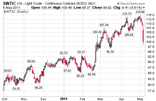 Commodities got smacked hard across the board on Thursday with silver and crude leading the way. Silver is now down close to 30% from the peak, and crude is down close to 13% from the peak four days ago. The rest of this post deals specifically with crude.