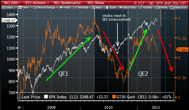 A friend sent me this chart that looks at the equity market and the history of QE. The pattern is pretty clear. When QE is first announced stocks catch a bid and bonds trade lower. When QE is ending the opposite has happened. Stocks work lower and so do longer-term interest rates.