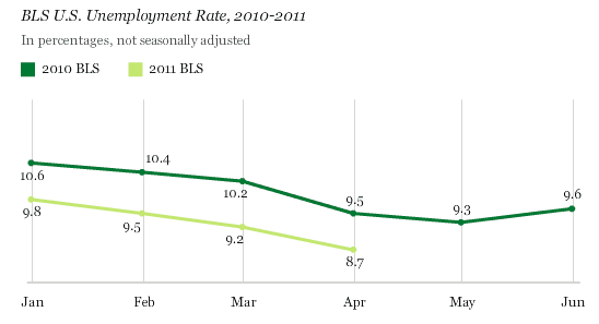 More important than the year-over-year change in the U.S. jobs situation may be the lack of overall job growth during the first several months of 2011. Gallup data suggest that the improvement in the jobs situation from February of this year through mid-May could be largely due to seasonal hiring factors, given the similar unemployment patterns of 2010 and 2011. This seems consistent with government data showing a seasonally adjusted unemployment rate that began at 9.0% in January 2011, dipped in February and March, but ended up at 9.0% once again in April — reflecting essentially no improvement in the jobs situation over the first four months of this year.