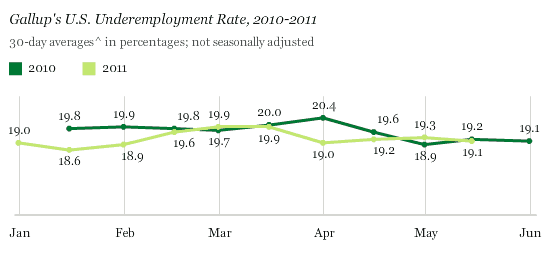Underemployment, a measure that combines the percentage of unemployed with the percentage working part time but wanting full-time work, was at 19.1% in mid-May — down from 19.3% at the end of April. Underemployment remains as high as it was in mid-May 2010.