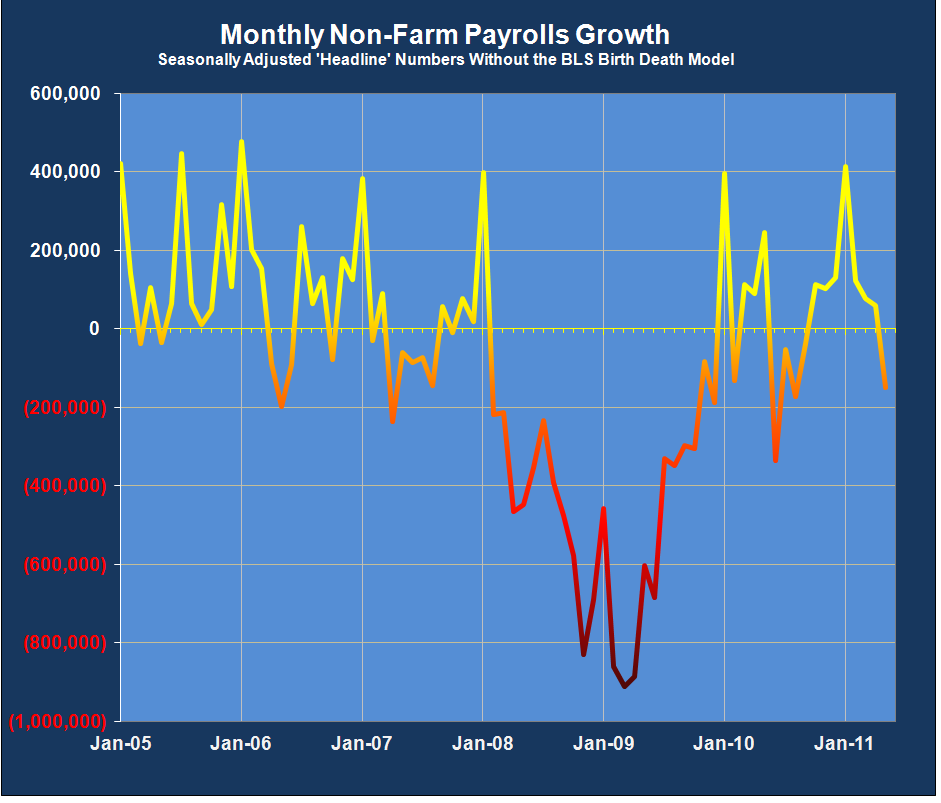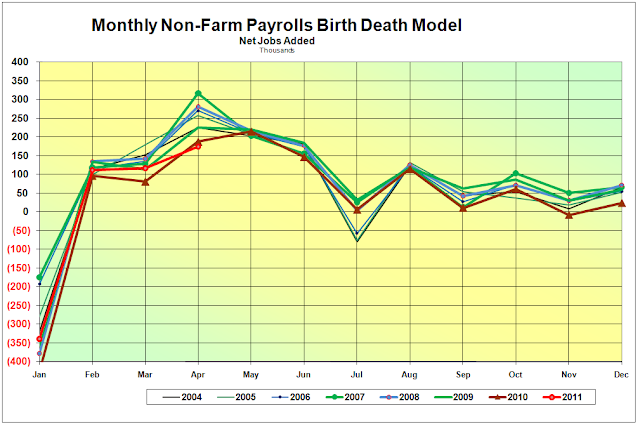 There were some ‘screaming headines’ at some blogs this morning about the BLS Birth Death Model, aka the ‘imaginary jobs report, reaching some new heights, or lows if you will, of perfidy in misstating jobs growth with a reading of 206,000 imaginary jobs added.