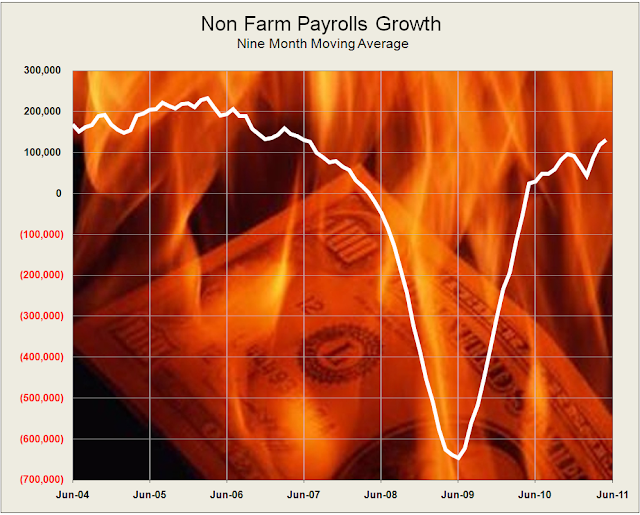 I deseasonalize and back out the imaginary jobs each month, and post what the monthly jobs number would look like without them as shown below. It’s a choppy picture even with the seasonality factor. This is why I prefer to watch a moving nine month average. And I also greatly prefer to watch the changes in median wage, which is probably as much or more important than the actual jobs added.