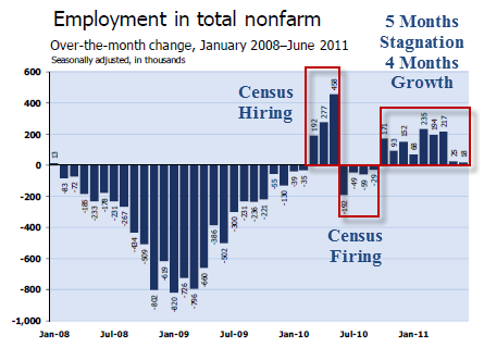 Ignoring the effects of the census, in the last 9 months of a recovery 2 years old, the economy is averaging 130,000 jobs a month. That is very poor as recoveries go.