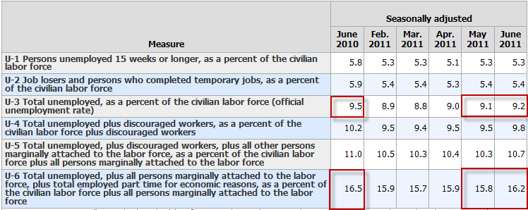 The official unemployment rate is 9.2%. However, if you start counting all the people that want a job but gave up, all the people with part-time jobs that want a full-time job, all the people who dropped off the unemployment rolls because their unemployment benefits ran out, etc., you get a closer picture of what the unemployment rate is. That number is in the last row labeled U-6.