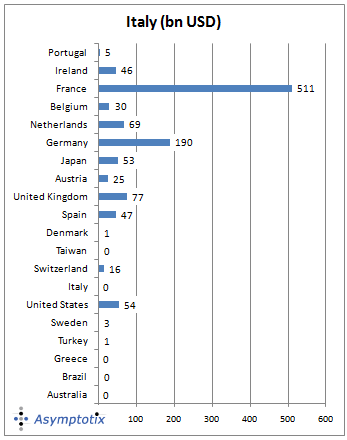 Obviously, this graph shines a light on other things as well. For one, European banks’ holdings of Italian debt is 7-8 times bigger than that of Greece. Where it’s taken European leaders forever to accept, as they did today, that there will have to be haircuts for private investors. When time comes to address Italy’s debt, "haircut" won’t be an appropriate metaphor. It’ll be more like putting their heads through a lawnmower, and without anaesthetics.