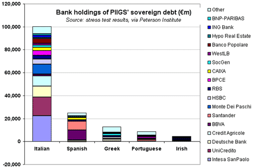 If we broaden our scope to look beyond banks, and include other institutional investors in PIIGS debt, this is the picture we get: