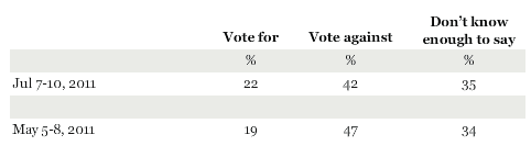 Despite agreement among leaders of both sides of the political aisle in Washington that raising the U.S. debt ceiling is necessary, more Americans want their member of Congress to vote against such a bill than for it, 42% vs. 22%, while one-third are unsure. This 20-percentage-point edge in opposition to raising the debt ceiling in Gallup’s July 7-10 poll is slightly less than the 28-point lead (47% vs. 19%) seen in May.