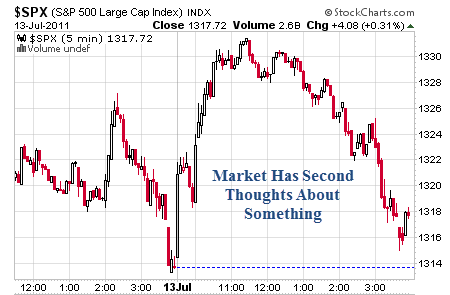 As I type, I note that the S&P futures are down 4 points to 1308. I also note that gold held nearly all of its gains today as did the $HUI, unhedged miner index.