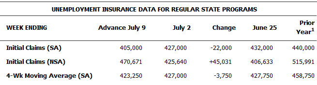 In the week ending July 9, the advance figure for seasonally adjusted initial claims was 405,000, a decrease of 22,000 from the previous week’s revised figure of 427,000. The 4-week moving average was 423,250, a decrease of 3,750 from the previous week’s revised average of 427,000.