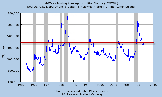 Subtracting 11,500 would drop the number to 393,500. That would be a good number on a relative basis, but the 4-week moving average is quite high 2 years into a "recovery".