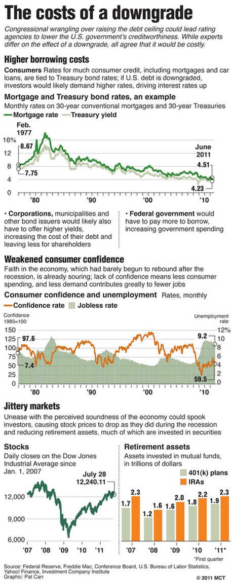 A downgrade could also have a negative impact on the dollar driving up consumer inflation, while diminishing consumer purchasing power. Moreover, the U.S. treasury accounts for a significant portion of many portfolios around the world, as it is historically the “safe” investment. A downgrade of the U.S. bond would have a serious wealth reducing effect on a global scale. It would also derail consumer and business confidence. No investment / spending equal no new job creations, which would make the unemployment situation even worse. (See graphic from McClatchy)