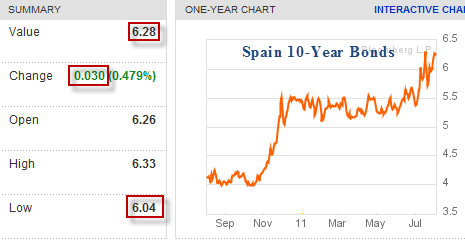 Early this morning I was watching yields on European government bonds. Italy and Spain were lower. I was wondering if the ECB had stepped in. However, in what will be billed as a "successful" auction, rates headed North.