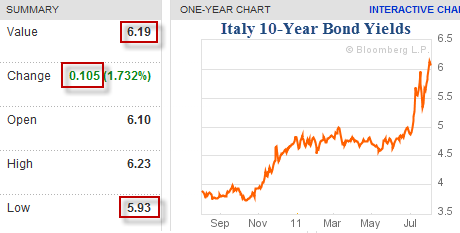 At 7:54 AM (different writer), Reuters had this story to tell: Yields jump at Italy bond auction