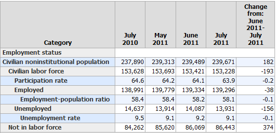 Please consider the Bureau of Labor Statistics (BLS) July 2011 Employment Report.